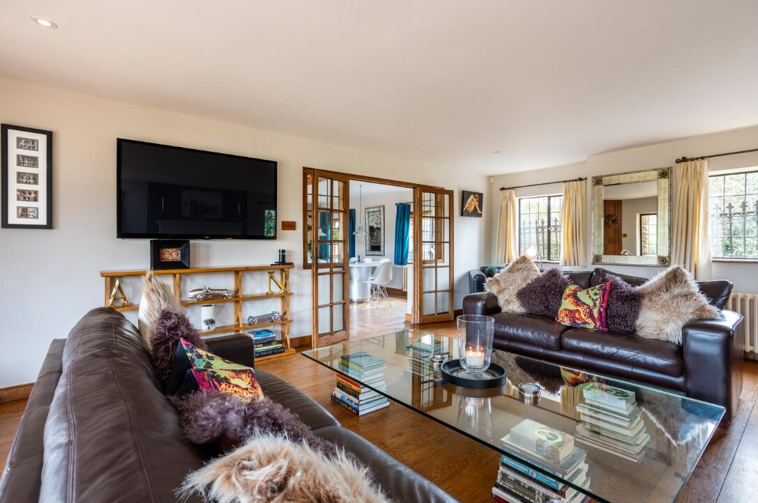 The house is beautifully appointed with stone and wooden floors throughout, large windows providing abundant natural light, and tasteful furnishings that can be moved or stored on-site if needed for productions.