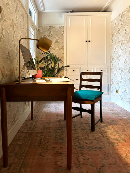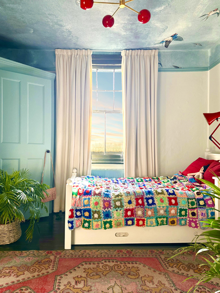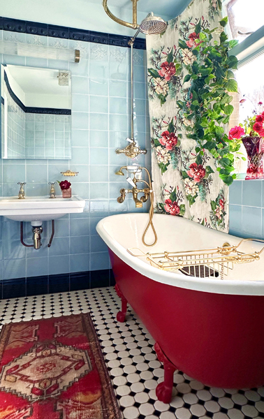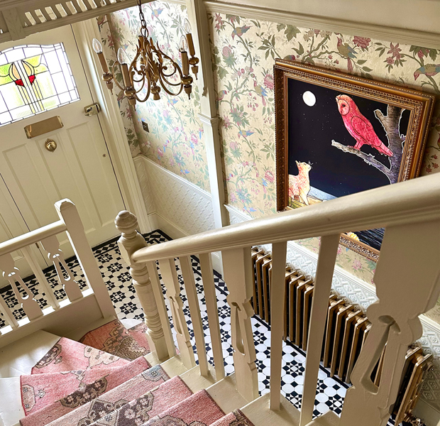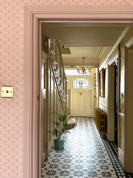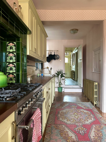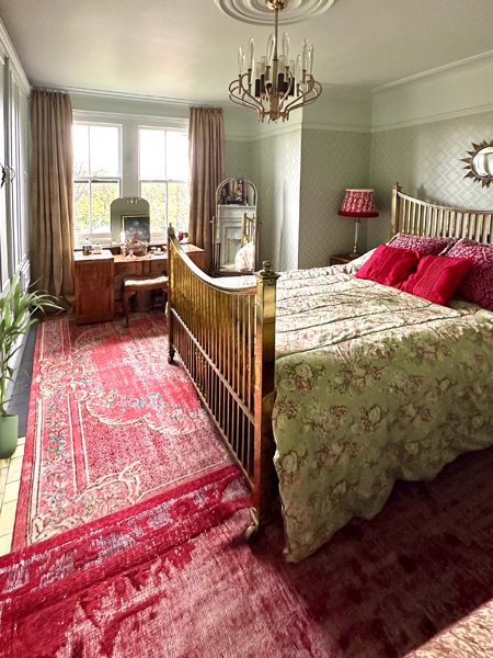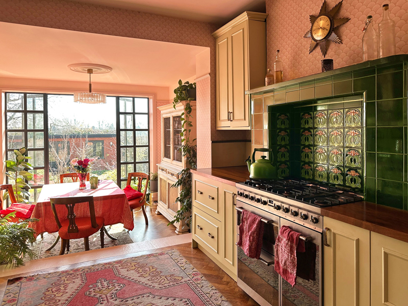 The interiors are decorated in a bold, colourful, and vintage-inspired style, with patterned wallpapers, antique furnishings, and statement lighting throughout.