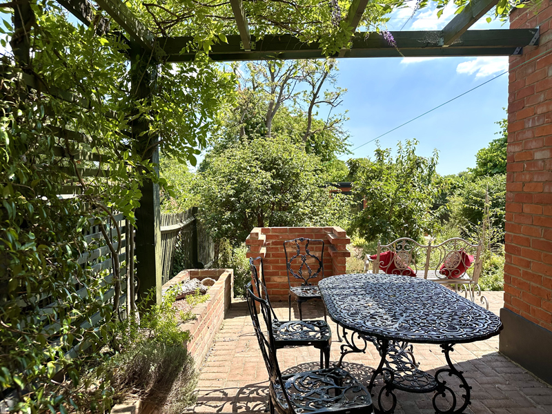 A 1930s-style kitchen with Crittall steel double doors opens onto a herringbone brick patio, while stained glass French doors lead from the dining room to a secluded outdoor seating area beneath a leafy pergola.