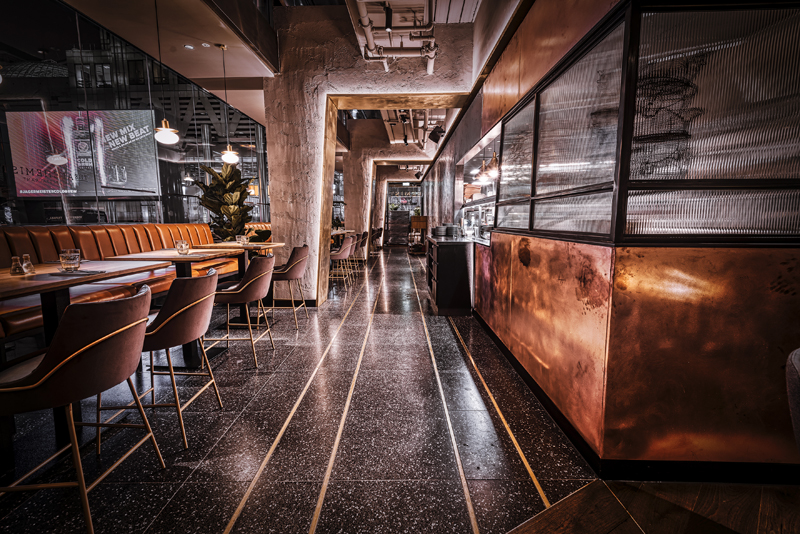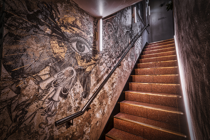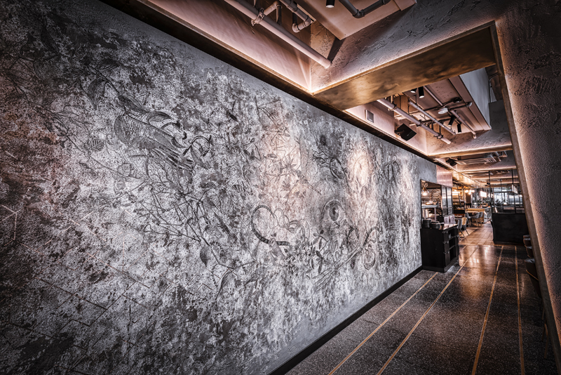 Its walls painted with molecular mixology themes are full of details that give it a unique aesthetic appearance.
