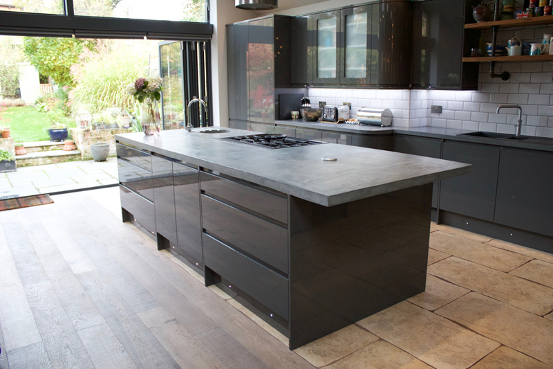 Late 1800’s Victorian, semi detached House,The rear space consists of a bank of matt grey kitchen units. An outward facing -concrete- cooking ‘island’ sits in the first third of the space. An exposed brick wall runs right along the back. One end is all glass with bi-fold doors leading onto a terrace and garden. There’s plenty of space to rig lights and several cameras in front of the island