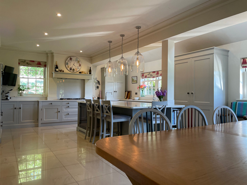 A cosy living room is accentuated by a wood burner and wide wooden flooring. There is an open plan kitchen/dining area with stunning views over the garden and unobstructed countryside.