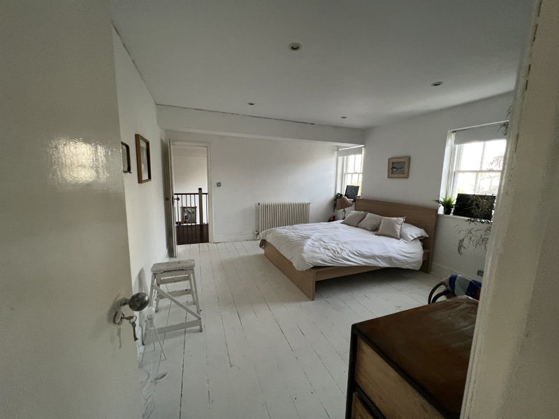 Downstairs studio is made of very high ceilings and huge windows allowing for a feeling of space and plenty of natural light, with a mezzanine leading to two bedrooms.