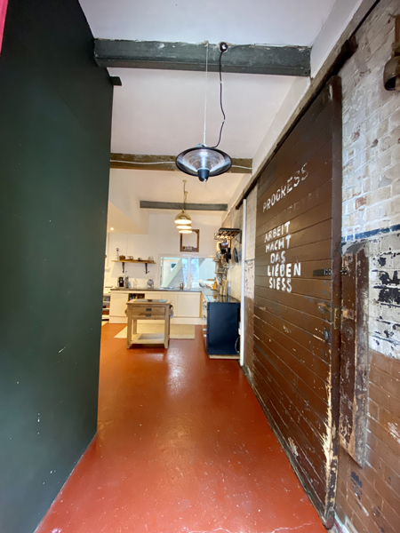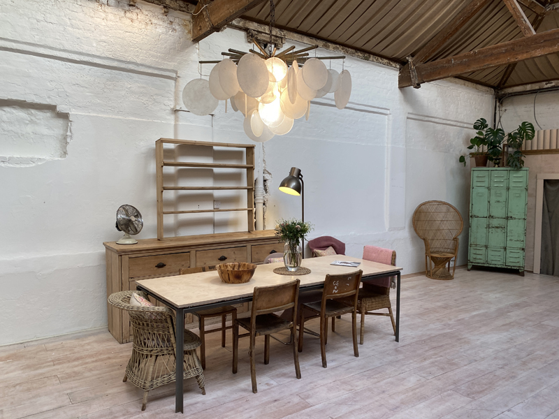 Skylights running the length of space brings in natural day light enhanced with an unusual hessian pleat design and original wooden beams, (suitable for draping or hanging lights) providing an authentic warehouse feel to the space.
