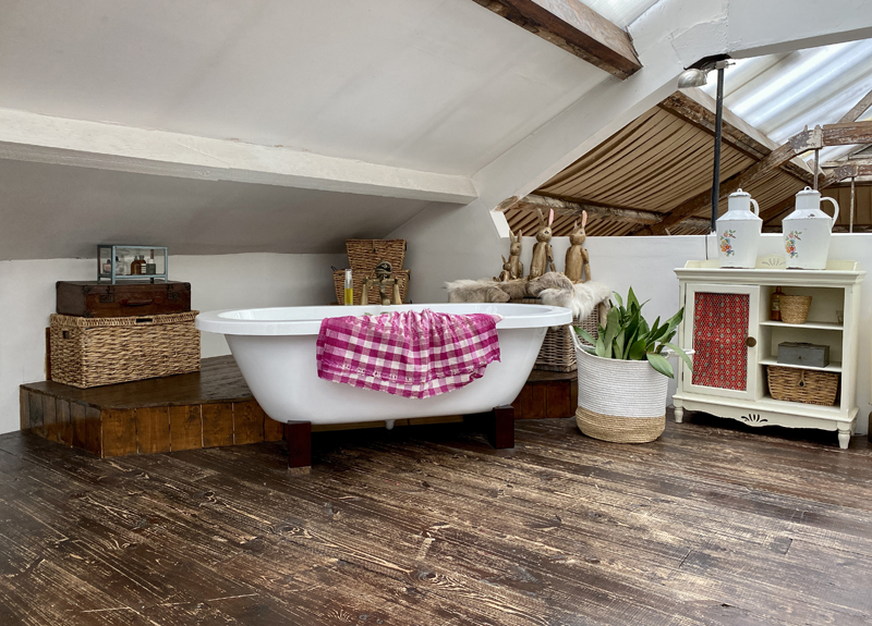 It’s very unique with an open bath feature, wood floorboards throughout , open beams and industrial pipes lending it great character and can be used for aerial shots, or placing lighting.