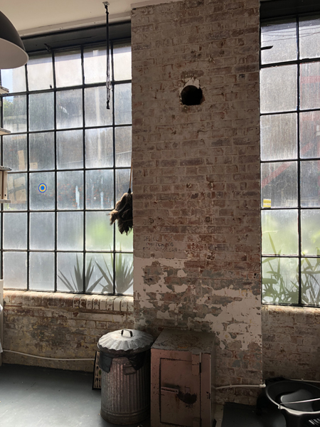 The studio is part of a large warehouse so has the industrial look of breeze block walls, high ceilings, and metal windows.