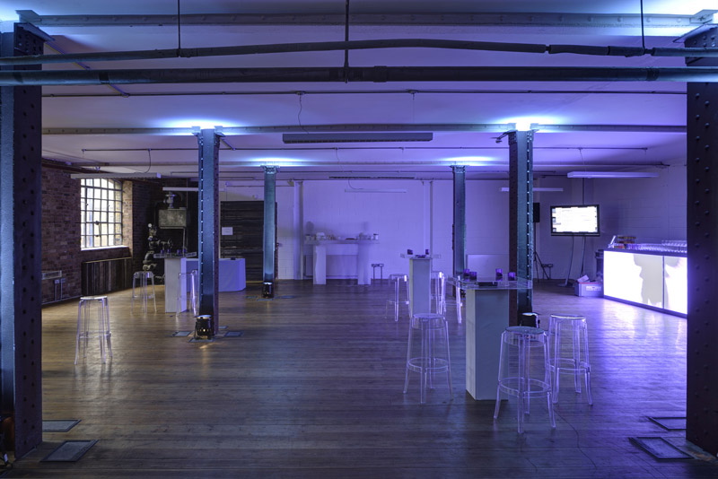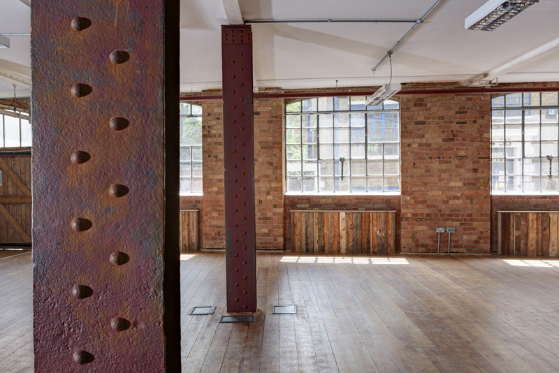 2352 square feet, light and airy ground floor studio, with steel pillars and an exposed brick exterior wall.